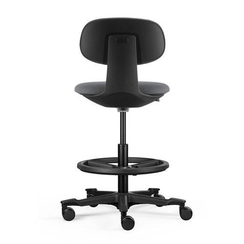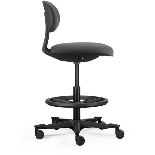 A height-adjustable sit-stand chair. The moulded foam seat and back and the nylon base with castors ensure user comfort and easy mobility. Wire-Control height adjustable mechanism. Castors. Black nylon 5 star base with Top Grip Treads. Curved, ratchet backrest. Greenguard Gold and BIFMA certified. Weight rating 110kg. Black Nylon Drafting Ring - 445mm Diameter. Chair Dimensions: Seat 450W x 440D x Seat 520-720mmH. Overall height: 820-1020mmH. 10 Year Manufacturer's Warranty.