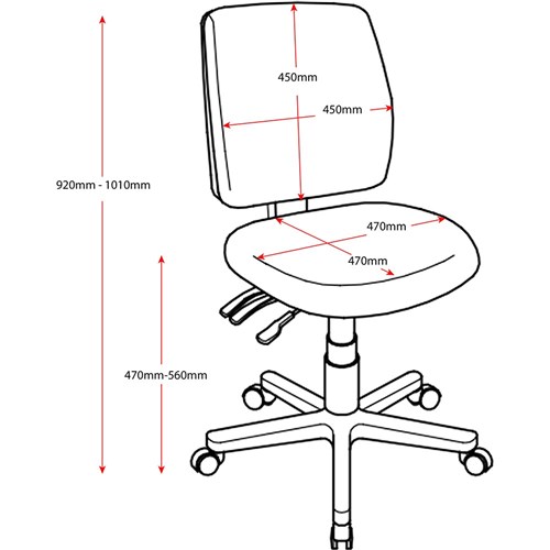 Fully ergonomic 4 lever heavy duty mechanism with seat slide. Fully upholstered. Heavy duty five star spider base with 50mm hard floor castors. Luxurious heavy duty moulded foam seat. AFRDI load rated to 160kg. Overall Size of 520mm W x 470mm D x 860 - 1010mm H. Seat size of 470mm W x 470mm D, seat height of 470 - 560mm H. 10 Year Manufacturer's Warranty. Delivery, installation and assembly charges may apply to furniture. Please enquire to confirm. Optional adjustable armrest available. Refer to product code 2834421.