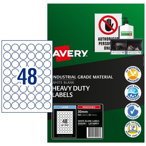 • Avery L4716 White 30mm Round Safety & Industrial Removable Heavy Duty Label