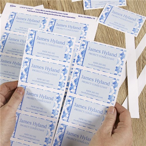 Design and print your own print shop quality business cards from your desktop. Easy to use with simple online software, to create professional looking heavyweight cards 85x54mm with perfectly smooth edges - no perforations and no card curl. Unique technology for easy and quick separation of cards - simply click apart when printed. Starter kit contains: Satin white 220gsm colour laser printable cards PLUS software with pre-designed templates. Supported by free Avery templates available at www.averyproducts.com.au/print