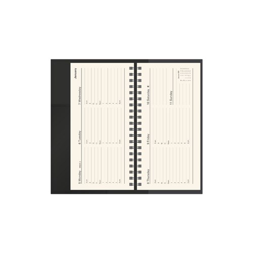 • Printed on a subtle cream paper, each dated page layout features a six-month to opening calendar, week numbers, Julian days, as well as both national and international public holidays.
