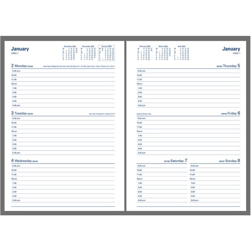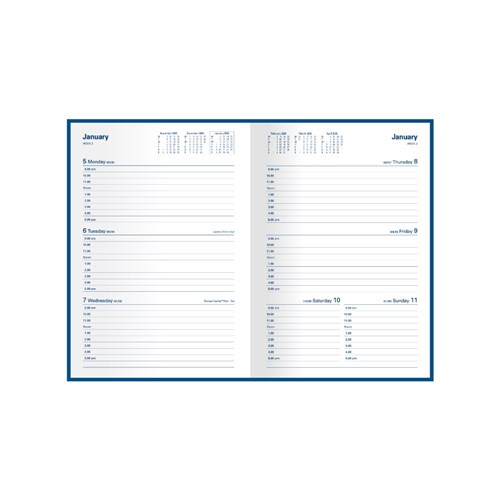 • Lay flat opening, ribbon marker, week to view layout.