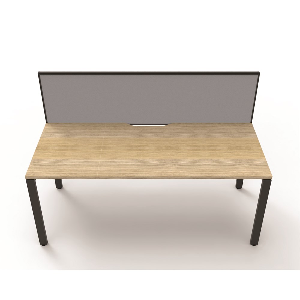 With Screen Natural White Worksurface With 410mm W x 50mm D Scallop Cable Access 1800mm W x 780mm D x 730mm H (Overall), 1800mm W x 750mm D x 730mm H Per User 60mm x 30mm Profile Leg Underframe In Black P/C 495mm H x 30mm T Pinnable Privacy Screen Upholstered In Grey Fabric With Matching Black Powdercoat Extrusion Adjustable Levelling Feet 5 Year Manufacturer's Warranty