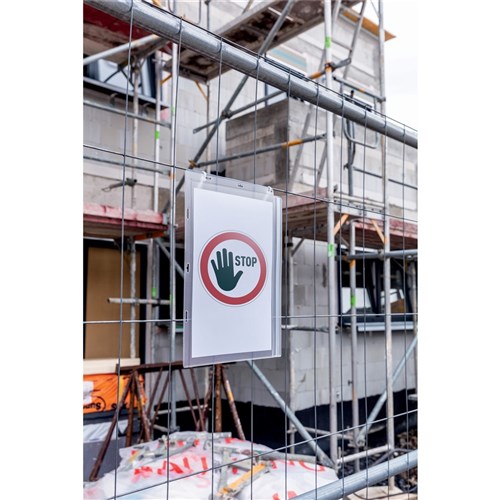 Water resistant, cable tie pockets for displaying notices or signs. The water proof pressure closure protects the contents against rain, humidity & dirt. Tested to IPX5 standards (can resist a sustained low pressure water jet spray). Can be used in portrait or landscape format. Anti-reflective.