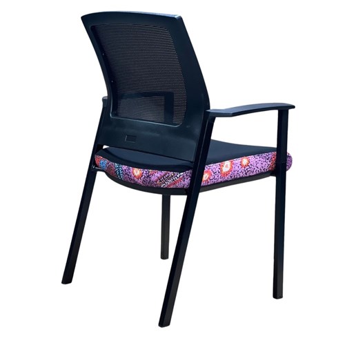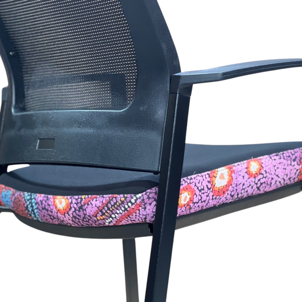 A unique commercial fabrics designed by Andrea Adamson (Indigenous Artist) combined with K2 Black Fabric to upholster the chair. Weight rating: 135kg. Indicated seat hours: 12 hours. Seat Dimensions: 505W x 450D x 490mmH. Back Height: 460mm. Back Width: 440mm. Heavy duty commercial chair with 3 lever mechanism and ratchet back height adjustment. Excellent posture correct lumbar. Solid, flat PU arms. Sleek design for comfort. Chairs stack 4 high. Product image for reference only. Design pattern may differ as a result of variations in the art work. 7 Year Years Manufacturer's Warranty. Delivery, installation and assembly charges may apply to furniture. Please enquire to confirm.
