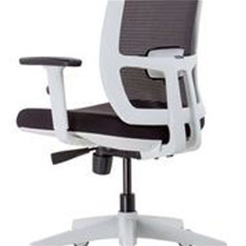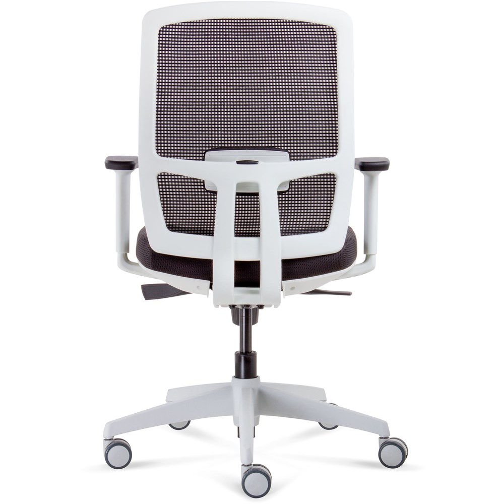 High back mesh executive chair with stylish white frame Synchro mechanism with adjustable arms ansi/bifma x 5.1-2011 and green guard gold certified 135kg weight rating 10 year warranty synchro mechanism with back rest and seat pan tilt gas lift, seat slide and lumbar support white 5 star base on castors black upholstered seat pan black mesh back